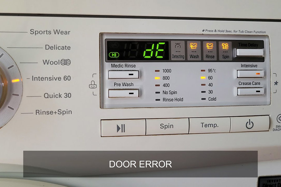 Đây là lỗi liên quan đến cửa máy giặt: cửa chưa đóng kín, có vật cản, công tắc cửa hoặc bo mạch gặp sự cố.